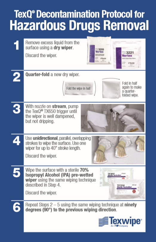 For hazardous drugs decontamination and disinfection use TX650 TexQ® DisinfectantSterile, Ready-to use solution in a 22-ounce (oz) bottle.